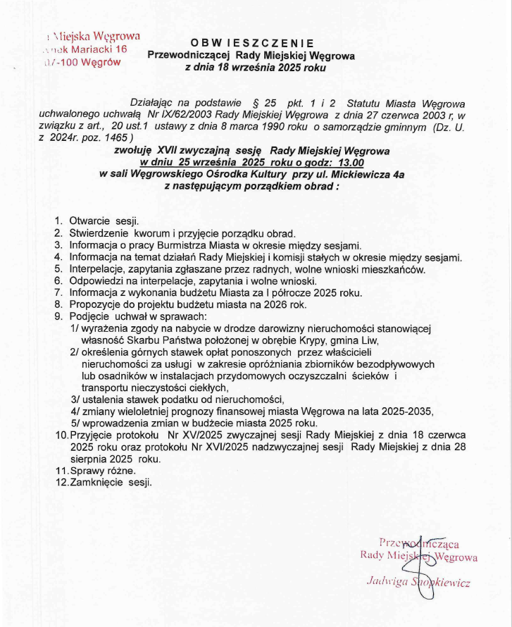 XVII zwyczajna sesja Rady Miejskiej WęgrowaArchiwum